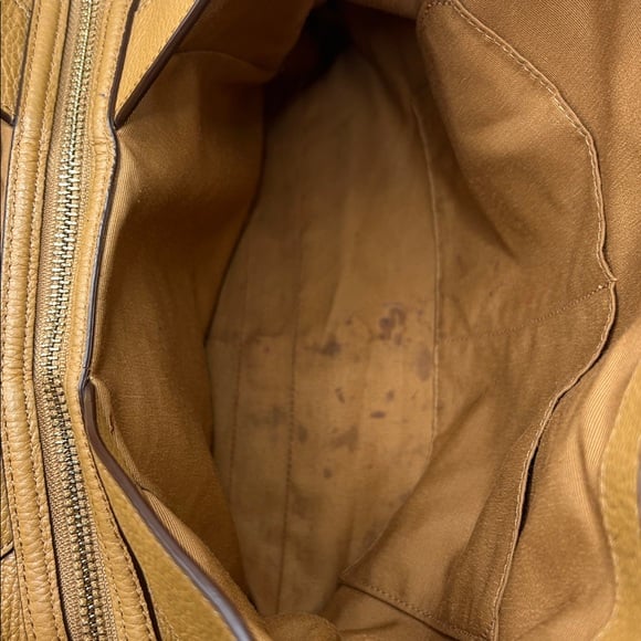pebble leather, gold tone hardware, saddle brown, center zip compartment, snap closure, fabric lining, shoulder bag, no crossbody strap