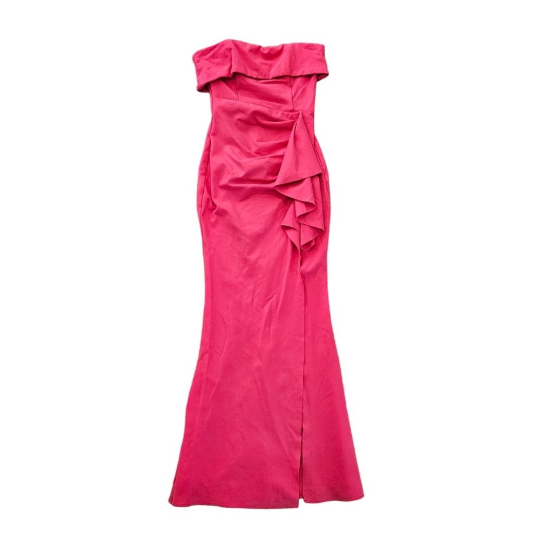 Stunning ELLIATT gown in solid pink crepe. A-line with strapless neckline. Hidden back back zipper close. Rubber grip along neckline to keep in place. Built-in boning in top. Material is 100% polyester and lined in 92% Polyester, 8% Spandex.