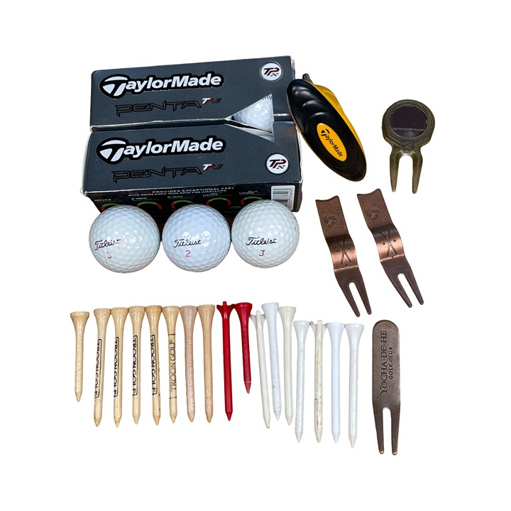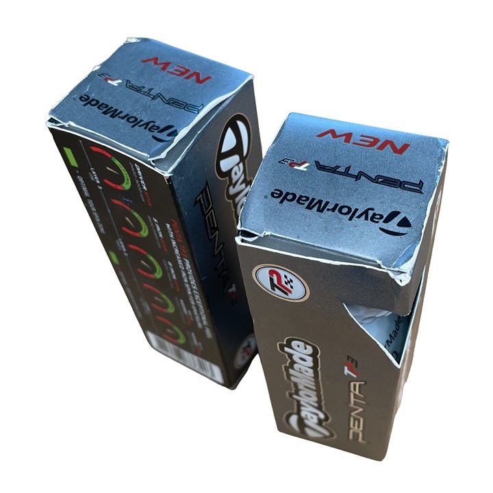 TaylorMade golf balls are brand new. One box has black ink of sorts that, if transferred to the gold balls, will clean up nicely. Other 3 balls, divots, tees and wrench will be included in purchase. Please review all pictures for more details on condition.